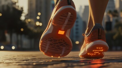 Jogger sprinting along seaside promenade with global map data overlay at sunset