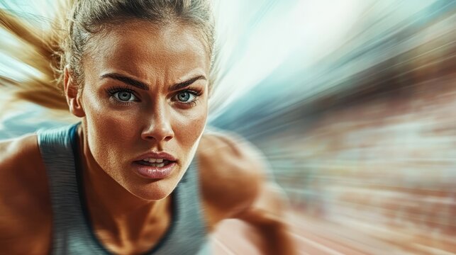 A female sprinter in full motion captures focus and determination as she races forward against a blurred background, symbolizing speed, drive, and athletic prowess.