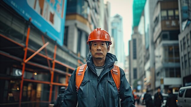 Determined worker striding purposefully through a bustling city, capturing the essence of urban hustle. The authentic atmosphere and candid moment.