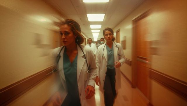 Confident corporate woman striding down glass corridor in navy suit, executive leadership