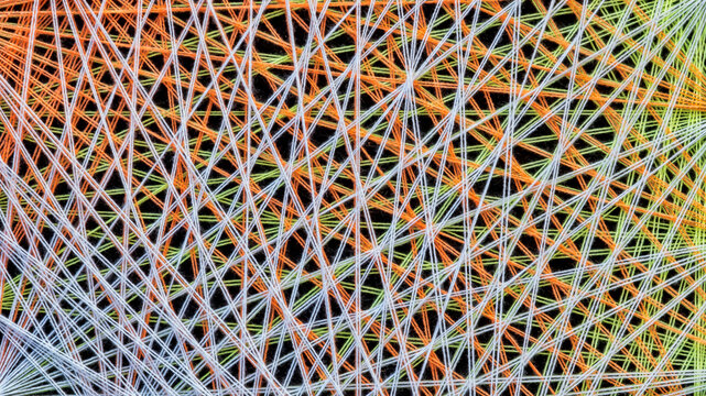 Craft string art in shape of heart. Red woolen heart, symbol of love, made of red wool yarn threads tangled over metal nails on canvas background