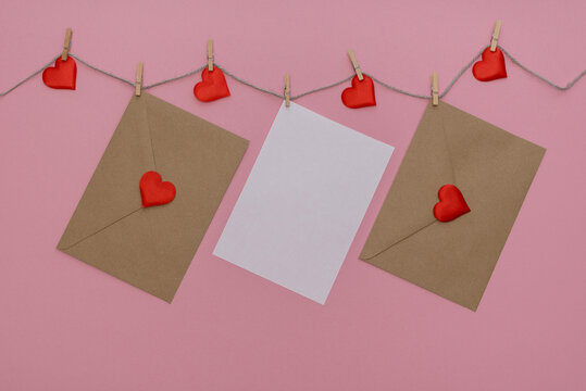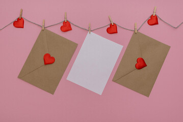 Three envelopes hanging on a string with red heart decorations. The background is pink, creating a romantic atmosphere.