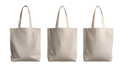 Three blank tote bags, white, black, and black, hang from strings against a teal and peach background