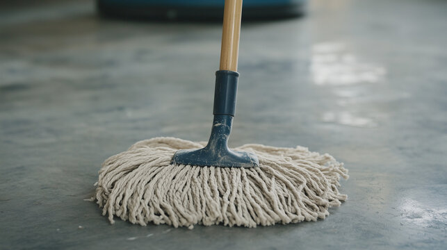 Mop Cleaning Floor: A close-up shot of a traditional string mop cleaning a concrete floor, emphasizing the texture and the process of cleaning.