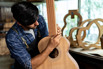 A stringed instrument maker inspects the strings of a guitar, generative AI