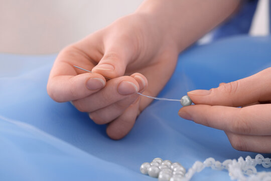 Dressmaker stringing bead on thread at light blue fabric in atelier, closeup