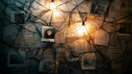 Dimly lit bulletin board filled with notes and photos, with strings forming a web-like pattern suggesting an investigation   -