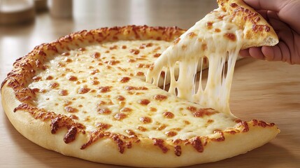 Stretching cheesy pizza slice pulls long strings of melted mozzarella, making mouths water instantly