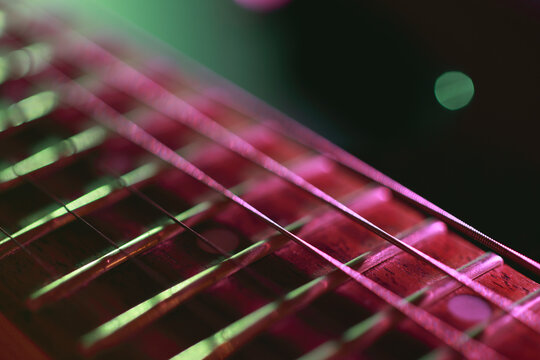 Close-up of electric guitar strings in colored light.