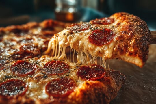 A delicious slice of pepperoni pizza being lifted, showing the stringy melted cheese