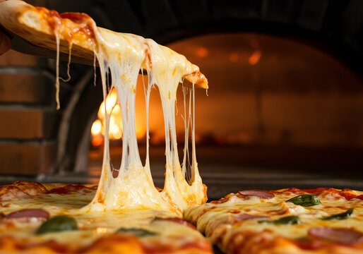 A close-up of a delicious cheese pizza slice being pulled from the pizza with stretchy, melted mozzarella cheese, perfect for advertising pizza restaurants or delivery services.