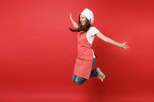 Couple dancing while cooking together in bright modern kitchen wearing striped aprons
