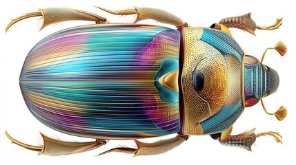 A colorful, iridescent beetle with intricate patterns, viewed from above on a white background.