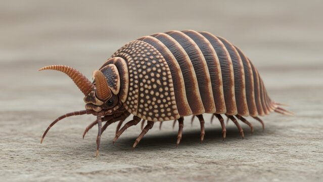 A brown and black striped pill bug on a gray surface.