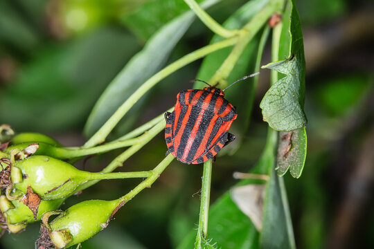 Red and black Italian Striped Beetle or Minstrel Bug (Graphosoma lineatum). Stinky bug on the leaf.