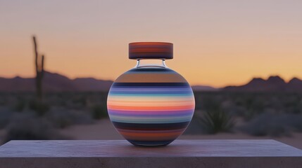 A spherical glass vase with vibrant horizontal stripes of colorful sand artfully layered within it sits on a surface with a desert landscape and sunset in the background