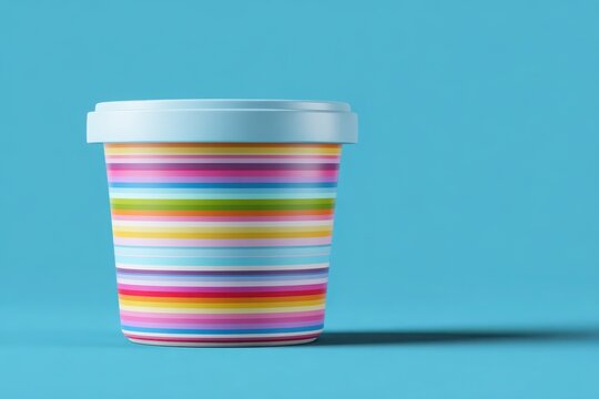 Colorful striped pot against a vibrant blue background, perfect for spring gardening or festive decor. Snack container mockup