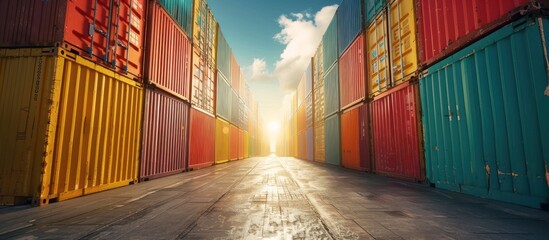 Sunlit container terminal leading toward horizon with stacked shipping containers