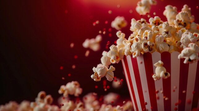delicious popcorn scattering from a red striped carton box on red background with copyspace