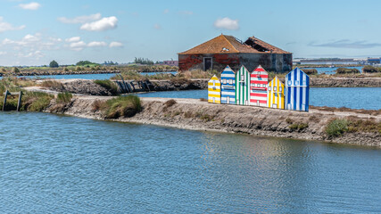 Vibrant beach huts line a sunny coastline, offering a picturesque seaside escape