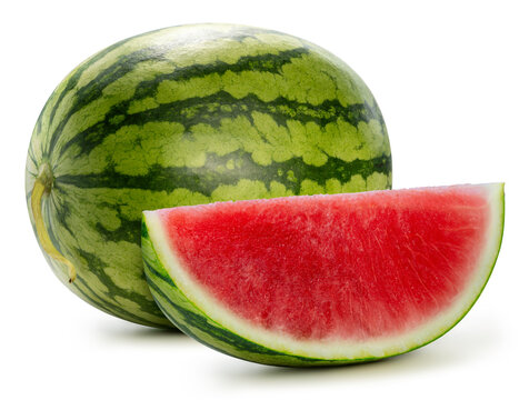 Whole, striped melon beside a juicy slice with seeds on a clean white background