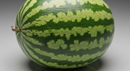 Close-up of a ripe watermelon with green stripes on a gray surface.