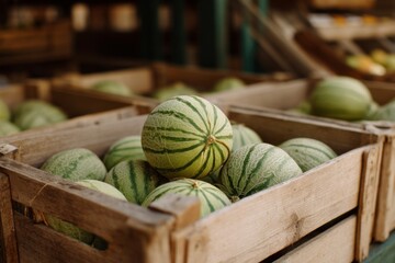 Harvested green striped melons packed inside weathered wooden crate for market sale offering fresh produce