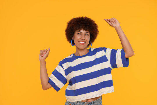 Full length photo of lovely young woman shopping try on new jeans defile dressed stylish striped outfit isolated on yellow color background