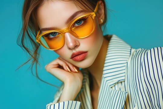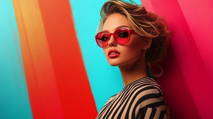 fashion cover, blonde model in colorful striped outfit in fashion sunglasses on striped background