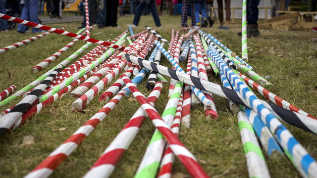High angle view of striped poles on sidewalk