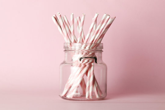 A lot of pink paper straws in a large bottle on a pink background. Top view. Place for text. Party concept.
