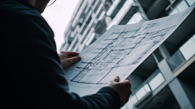 A close-up photograph of a structural engineer reviewing blueprints for a seismic retrofitting project on an aging skyscraper, Skyscraper retrofitting design scene, Structural analysis style