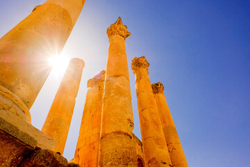 Ancient ruined columns in the Roman city of Jerash, Jordan