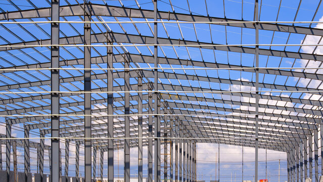 Geometric metal columns and roof beam structure of industry warehouse factory building in construction site against blue sky background