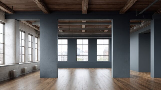 Minimal loft space with matte gray structural columns and dark timber ceiling, side-lit from large factory windows and moody