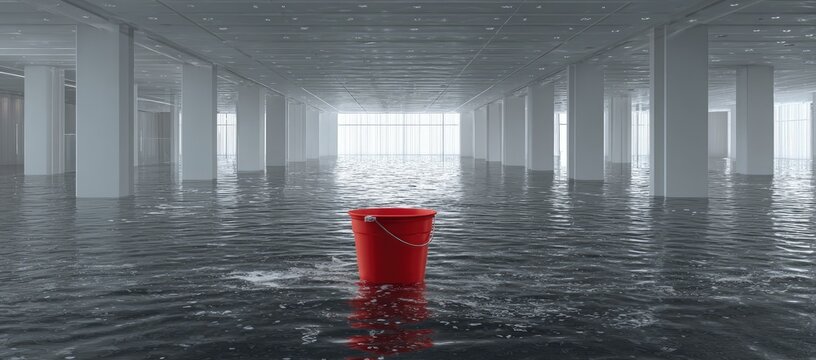 Flood damage in a modern, light-filled office space. A red bucket sits in the center of a flooded room with white pillars and windows