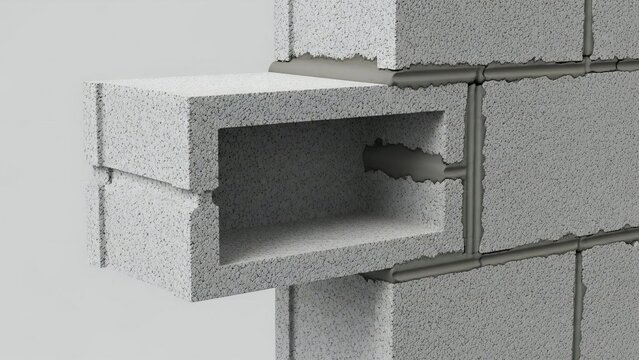 Close-up 3D Render of concrete blocks interlocking in a wall construction showing structural detail