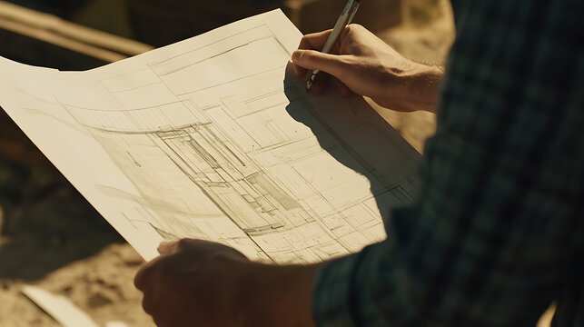 Engineer inspecting structural drawings at a construction site. Featuring planning and precision