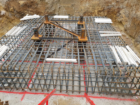 Construction site with tower crane base and mast cast in steel reinforcement. Industrial construction site photography. Foundation and structural support concept for design and documentation.