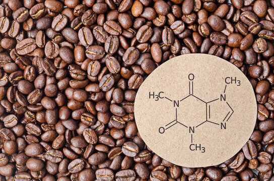 Structural chemical formula of caffeine molecule with roasted coffee beans.