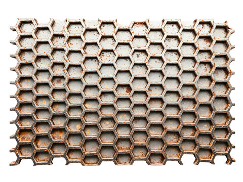 Old rusty industrial metal panel with a honeycomb pattern on a transparent background
