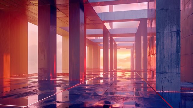 Urban geometry with reflected sunset, structural minimalism in orange hues