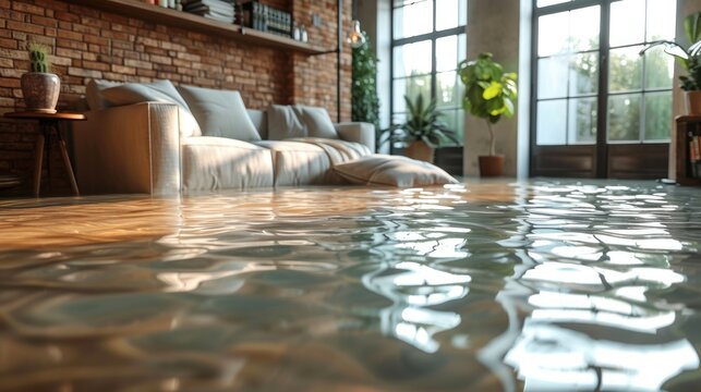Flooded Kitchen with Water Damage and Dehumidifier Symbolizing Water Extraction and Mitigation
