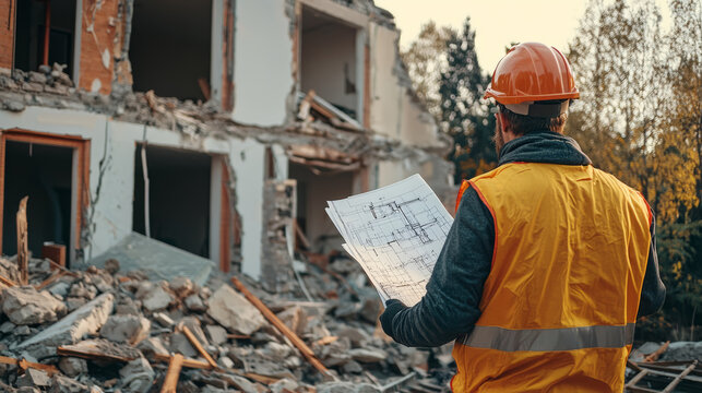 Worker walking in front of damaged commercial building, assessing structural destruction