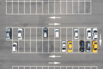 Aerial View of a Well Organized Parking Lot with Various Cars