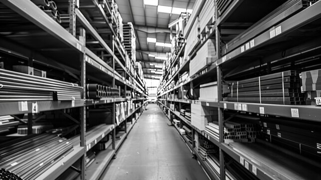 Store for home improvement and DIY. Warehouse aisle of building materials in industiral store. Bit dumpster, pipes. Shallow DOF