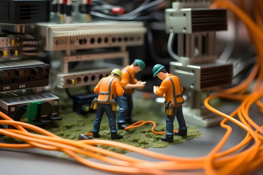 Team of Engineers Installing Fiber Optic Cables in Outdoor Environment with Safety Gear