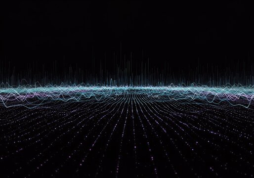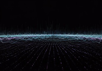 Abstract illustration of synchronized digital waves moving across a vast, dark field, representing theoretical quantum timing and structured emptiness ,background ,conceptual ,glow