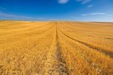 Big yellow field after harvesting. Mowed wheat fields under beautiful blue sky and clouds at summer sunny day. Converging lines on a stubble wheat field. Copy space.