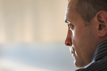 Annoyed father sitting back to back with son on sofa, ignoring each other after argue